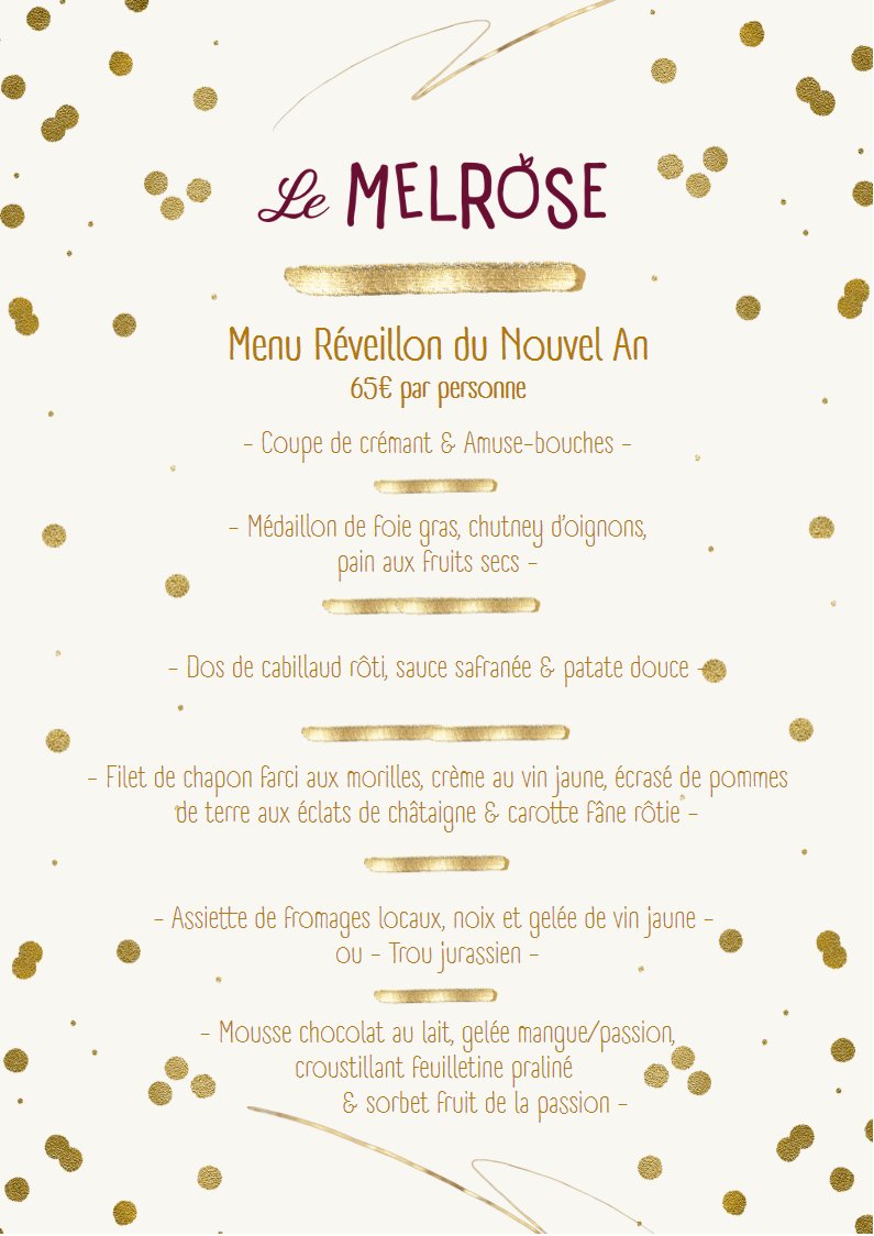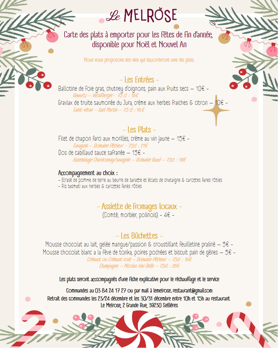 🎄 Découvrez la carte spéciale Melrose pour le réveillon, disponible sur place ou à emporter (voir photo).