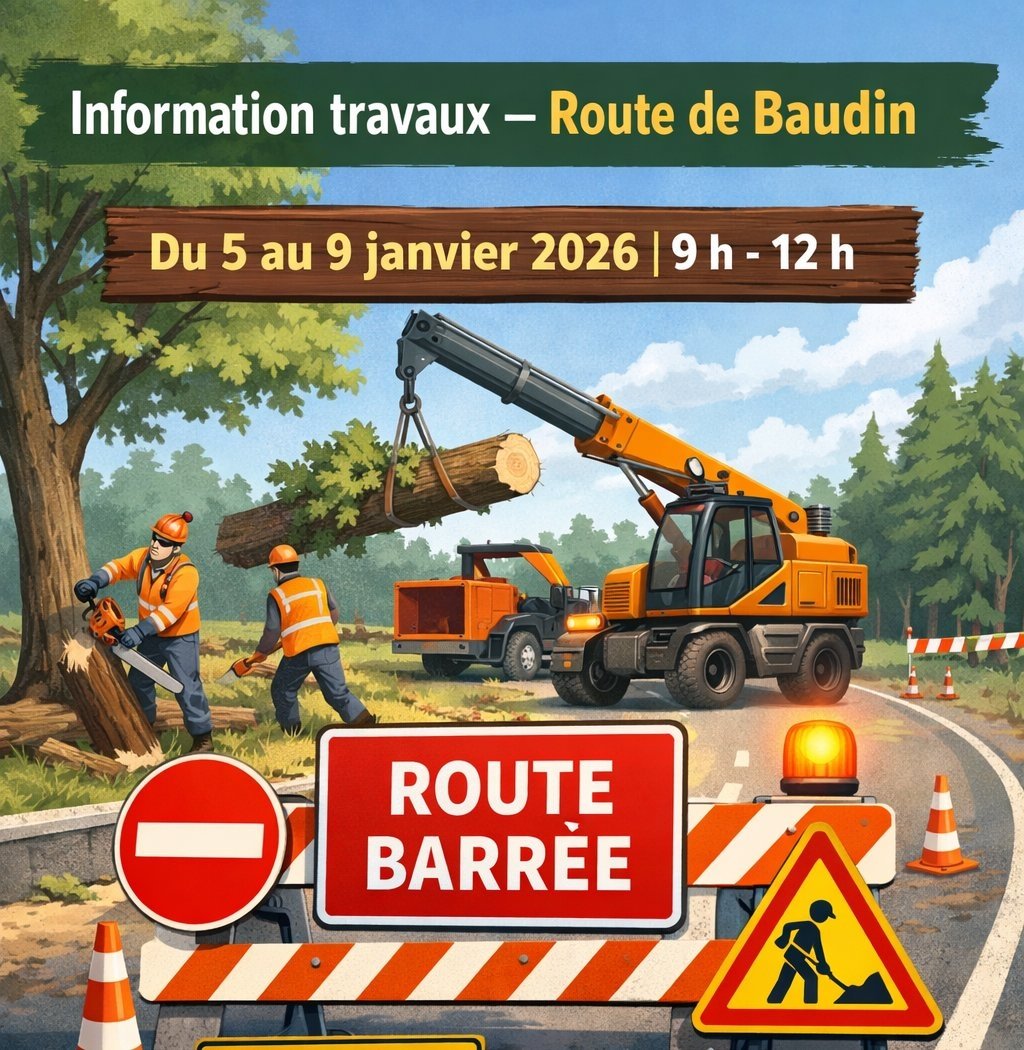 En raison des très mauvaises conditions météorologiques, les travaux d’abattage d’arbres prévus du lundi 5 au vendredi 9 janvier 2026 ont été reportés : Ils auront lieu, du lundi 19 janvier au vendredi 23 janvier 2026, chaque matin de 9 h à 12 h, le long de la route de Baudin (du chemin de Neprand Rochière - après le numéro 10 route de Baudin jusqu’au chemin de la Vaudrière).
