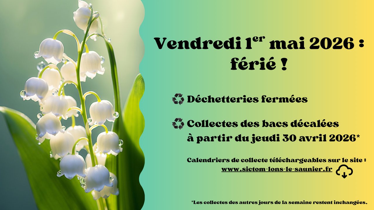 ⚠ Vendredi 1er mai 2026, les déchetteries seront fermées et les collectes des bacs seront décalées en raison du jour férié !