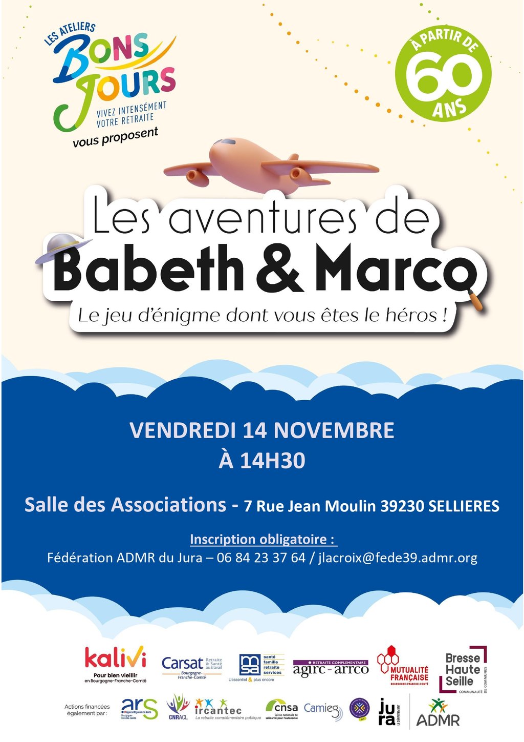 Votre participation est gratuite et sur réservation (nombre de places limitées). Pour vous inscrire ou en savoir plus sur Les Aventures de Babeth & Marco, contactez l’ADMR 39 au 06 84 23 37 64.