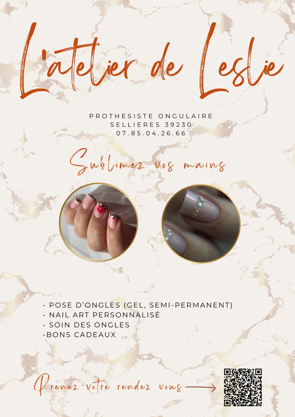 Installé à Sellières depuis mai 2025, L’atelier de Leslie est un espace chaleureux et cosy, où chaque détail compte. Je vous propose des prestations de manucure sur-mesure : pose de vernis, renforcement de vos ongles naturels ou ongles en gel, ainsi qu’un soin soigné des cuticules et des mains, pour des ongles résistants et élégants.